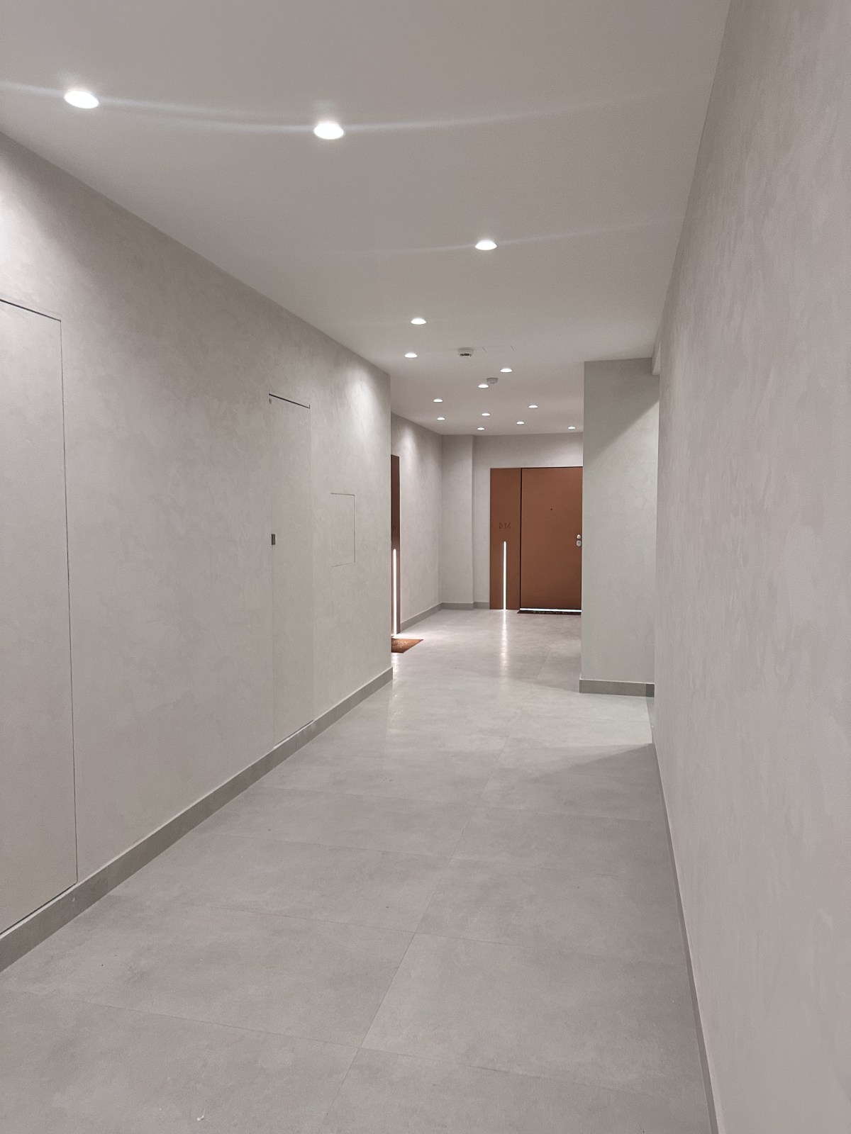The apartment is equipped with Geberit sanitary fixtures from the Smyle Square collection, sanitary faucets by Daniel Rubinetterie from the Fusion collection, and full plank engineered flooring by Ter Hurne, from the Hywood collection in Germany, all contributing to an elegant and functional space. Additionally, the bathroom ceramics by PAMESA PORCELANICO, Spain, add an extra touch of refinement and style.