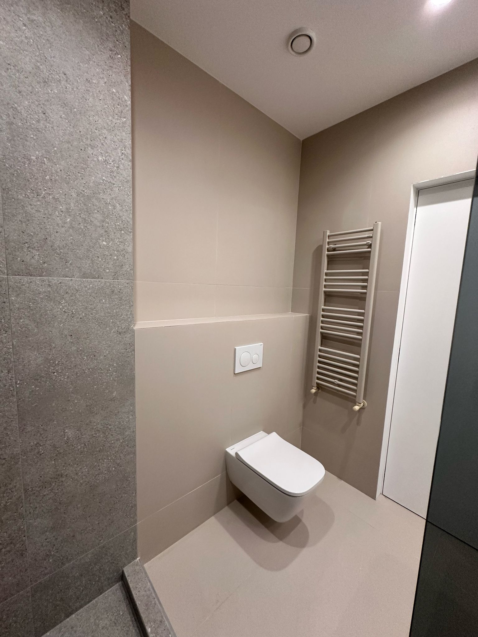 The apartment is equipped with Geberit sanitary fixtures from the Smyle Square collection, sanitary faucets by Daniel Rubinetterie from the Fusion collection, and full plank engineered flooring by Ter Hurne, from the Hywood collection in Germany, all contributing to an elegant and functional space. Additionally, the bathroom ceramics by PAMESA PORCELANICO, Spain, add an extra touch of refinement and style.